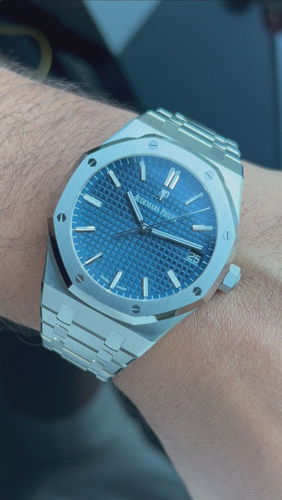 The Audemars Piguet Royal Oak Selfwinding Ref. 15500ST.OO.1220ST.01 is one of the most sought-after stainless steel Royal Oak references, distinguished by its blue “Grande Tapisserie” dial and balanced 41mm case.
