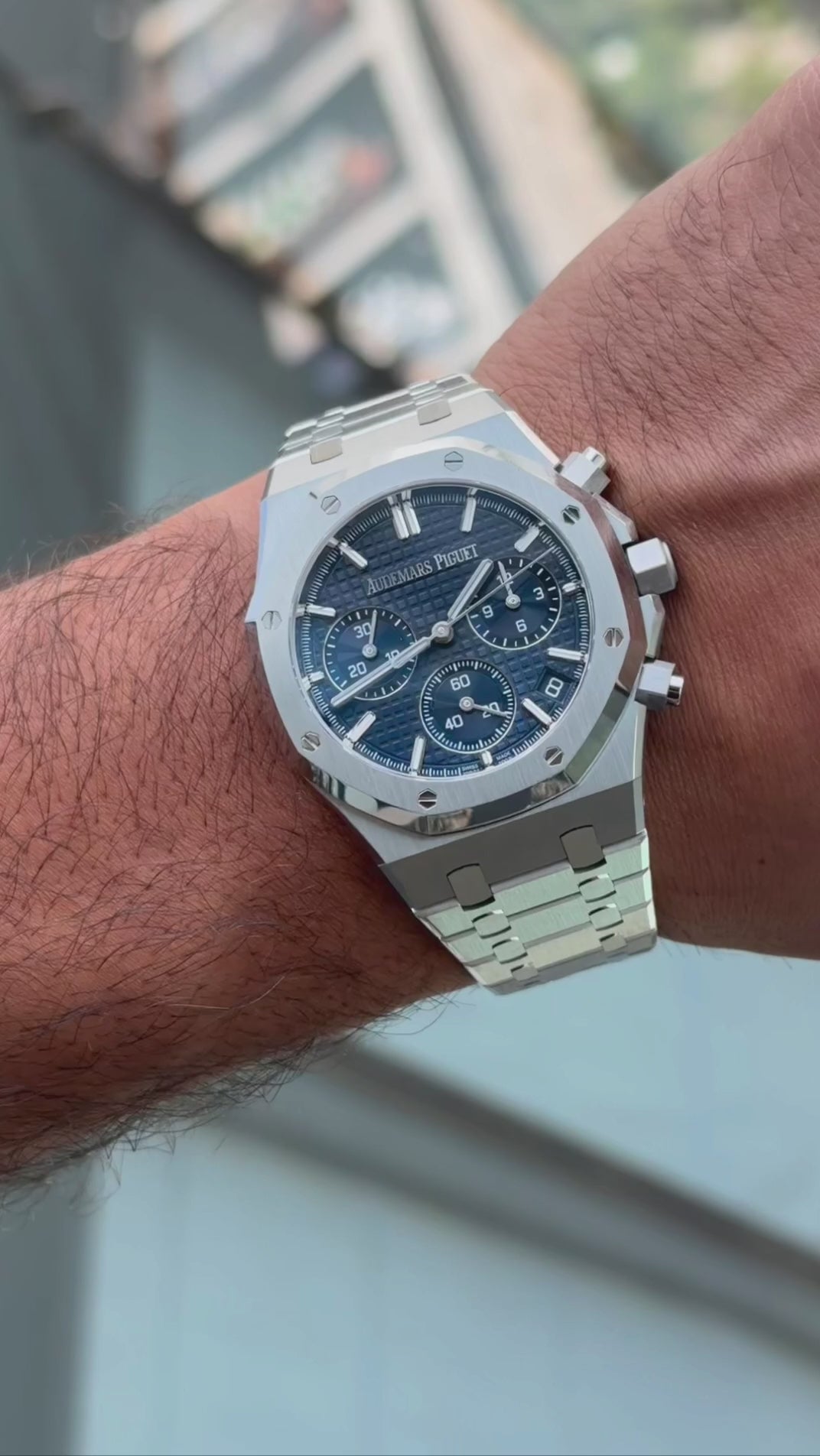 The Audemars Piguet Royal Oak Chronograph “50th Anniversary” 26240ST features the iconic blue “Grande Tapisserie” dial, a defining signature of the Royal Oak collection.